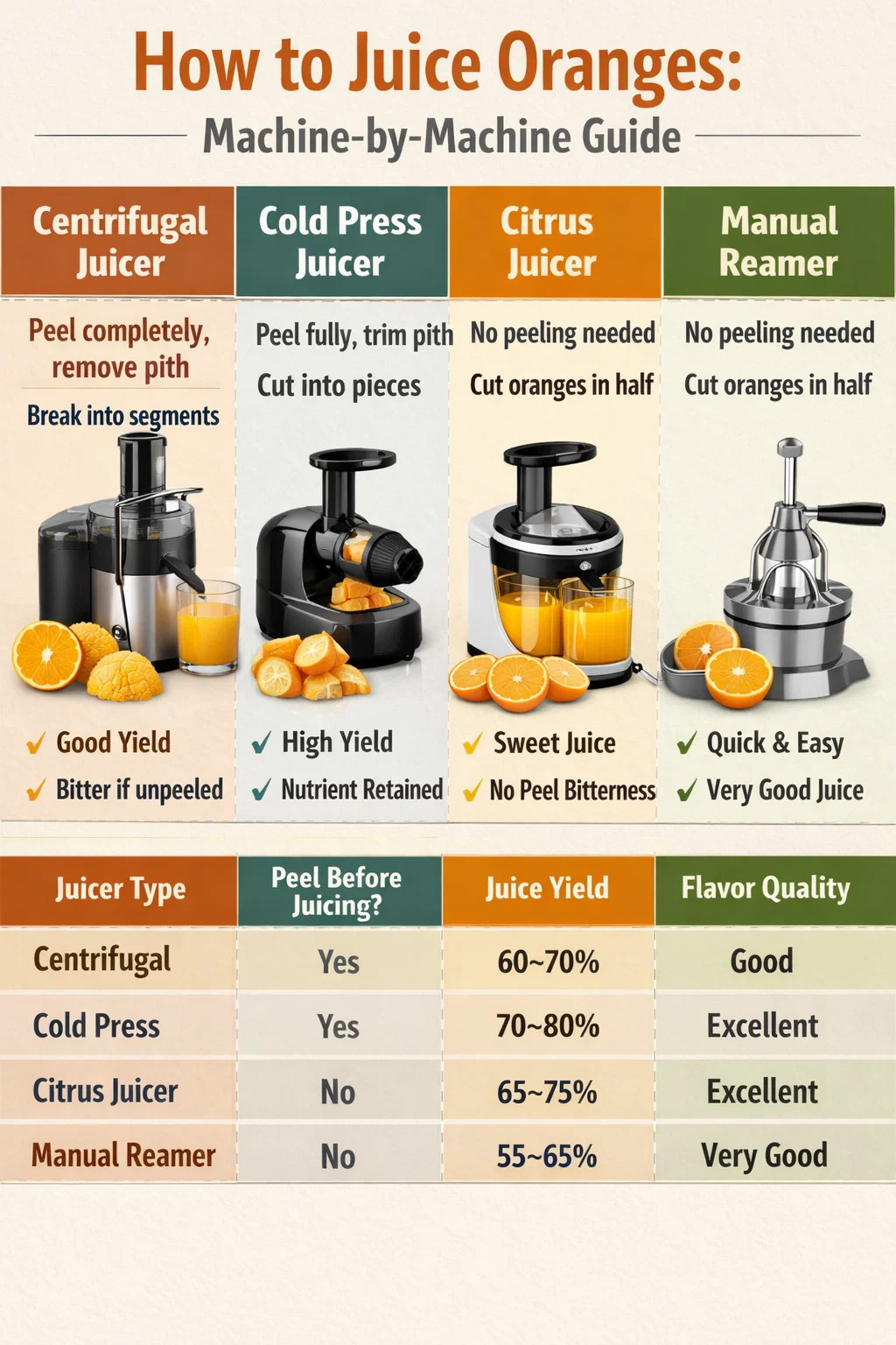 جدول زیر چهار نوع آبمیوه گیری اصلی را برای پردازش پرتقال، پوشش مورد نیاز آماده سازی، بازده آب، کیفیت طعم و زمان تمیز کردن معمولی مقایسه می کند.