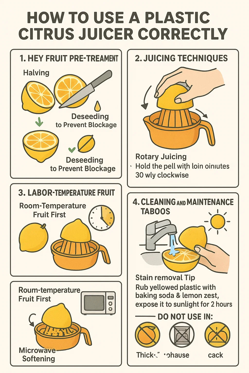 بلافاصله برای جلوگیری از رنگ آمیزی بشویید: بلافاصله پس از فشردن با آب سرد شستشو دهید (آب گرم نفوذ روغن میوه به پلاستیک را تسریع می کند و باعث زرد شدن آن می شود).