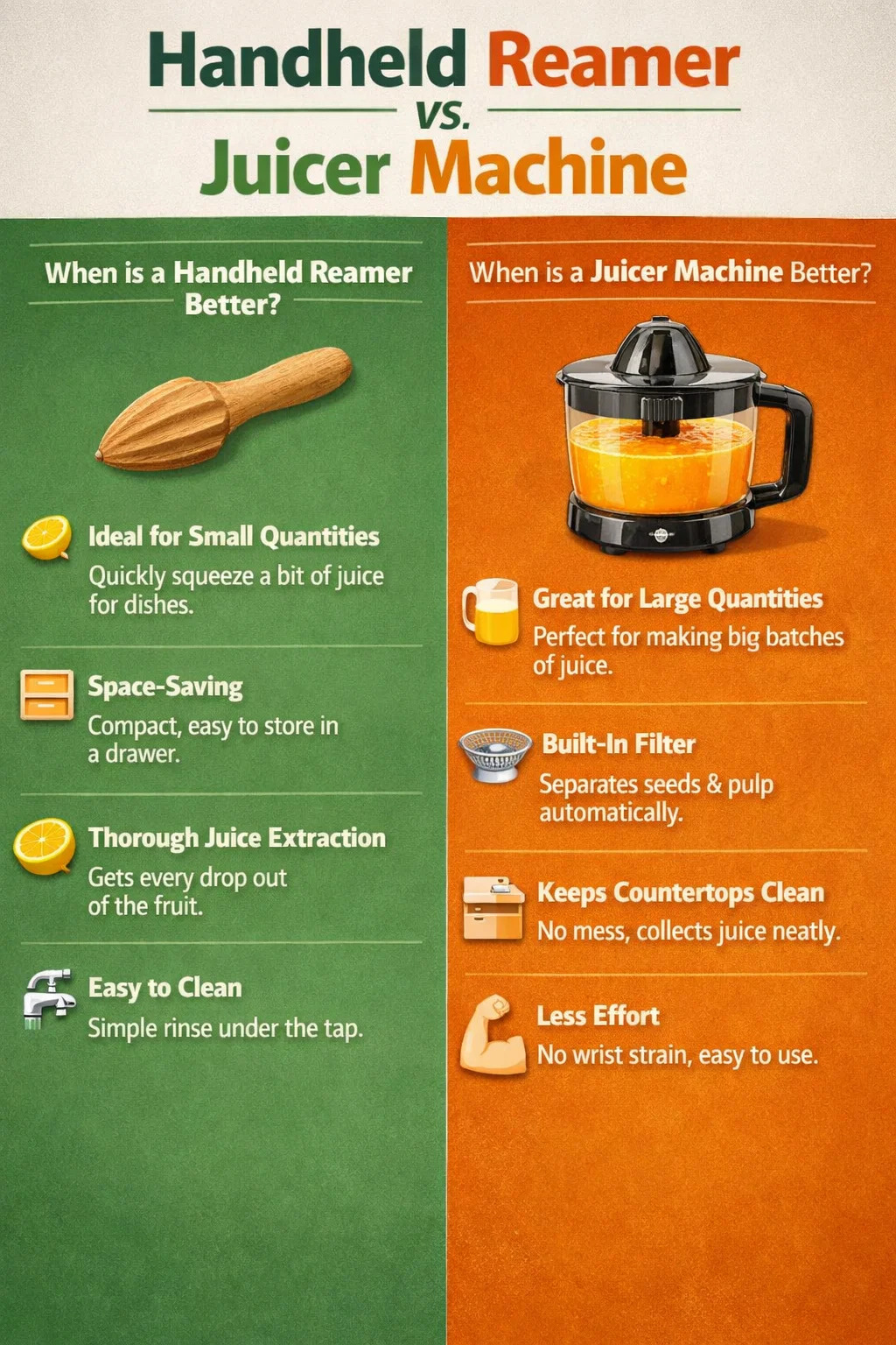 اگر لازم است یک پارچ کامل آب پرتقال را برای تمام اعضای خانواده بفشارید، استفاده از یک قیچی دستی باعث درد مچ دست شما می شود. در این مورد، آبمیوه گیری برقی یا اهرمی بسیار ساده تر است.