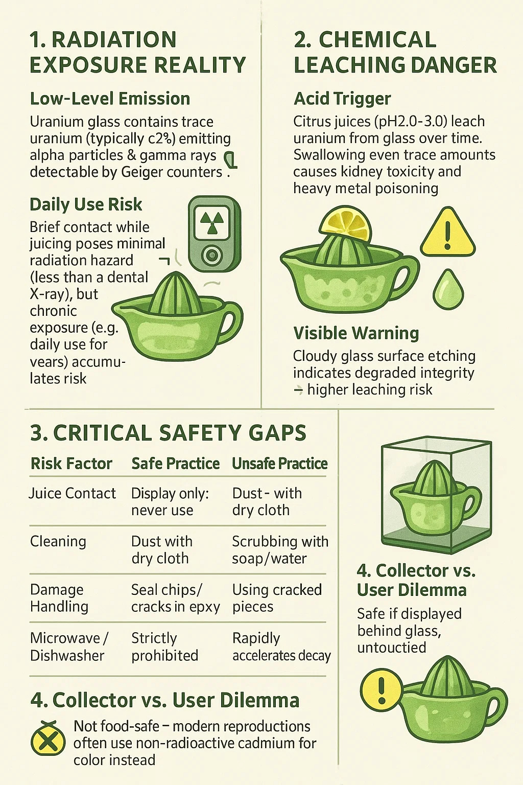 ماشه اسید: آب مرکبات (pH 2.0-3.0) اورانیوم را از شیشه به مرور زمان شستشو می دهد. بلع حتی مقادیر ردیابی باعث سمیت کلیه و مسمومیت با فلزات سنگین می شود.