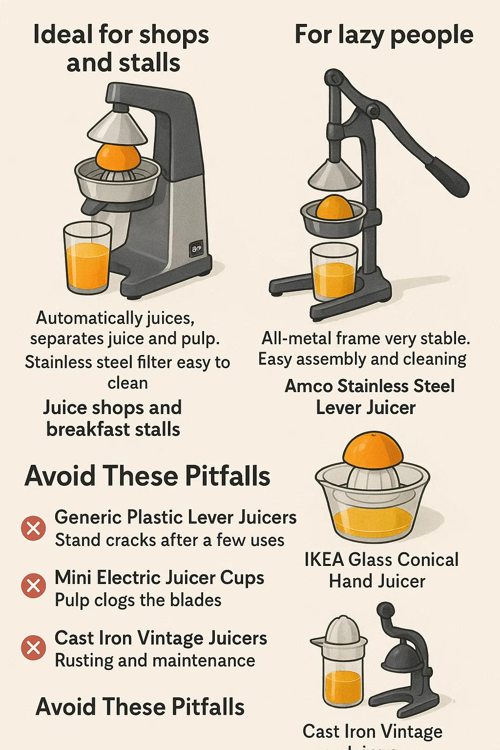 • آبمیوه گیری اهرمی پلاستیکی عمومی: پایه پس از سه بار فشار دادن پرتقال ها ترک می خورد و سوراخ آب میوه با دانه ها گیر می کند و شما را دیوانه می کند.