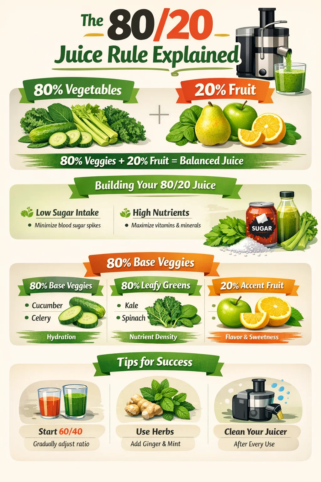 را قانون 80/20 برای آبمیوه گیری یک دستورالعمل تغذیه ای است که بیان می کند به ازای هر لیوان آب میوه ای که تولید می کنید، 80 درصد مواد باید سبزیجات و فقط 20 درصد میوه ها باشد . این نسبت برای به حداکثر رساندن دریافت فیتونوترینت ها و مواد معدنی طراحی شده است و در عین حال مصرف فروکتوز را به شدت محدود می کند. در حالی که با کیفیت بالا استفاده می شود آبمیوه گیری ایجاد معجون های خوشمزه را آسان می کند، اتکای بیش از حد به میوه های شیرین می تواند منجر به افزایش ناخواسته قند خون شود و بسیاری از اهداف سلامتی استخراج تازه را شکست دهد.